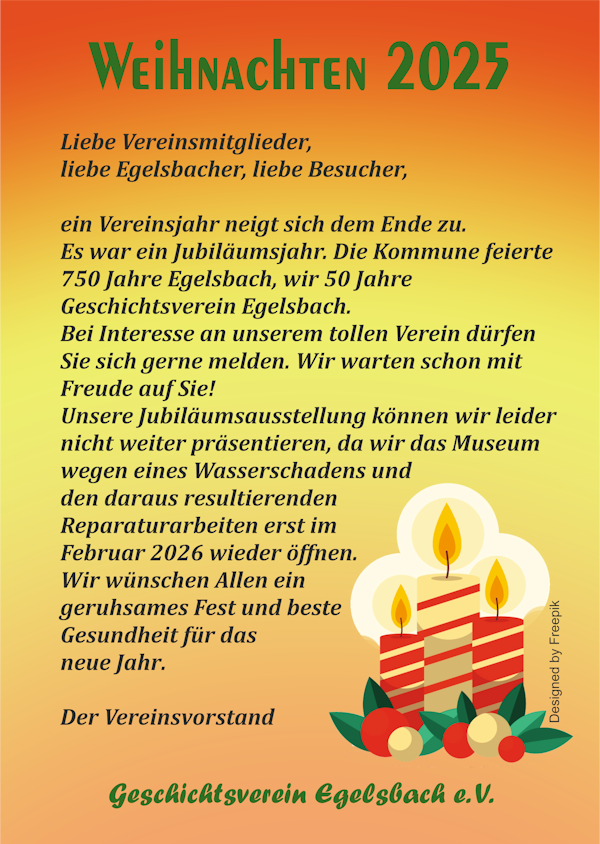 Termine Museum: Jeden ersten Sonntag im Monat (außer Januar). Jeweils von 15:00 Uhr bis 17:00 Uhr. Hier die älteren Ausstellungen als PDF: Ausstellung „Raffaels Engel“ von Brigitte Höf 2019-10 Ausstellung 125 Jahre Egelsbacher Feuerwehr 2019-06 Osterhasenausstellung 2019-04 Nikolausausstellung 2018-12 200 weiterlesen...